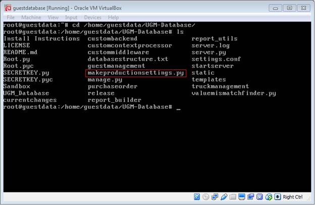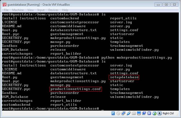 Alright, I am going to start going a little faster.  I am assuming you have figured out how to enter commands, so I will just explain what to run and show you the result of several commands at a time.  The first group is to run “cd /home/guestdata/UGM-Database/”.  This will Change Directory to the core of the database.  Then you run “ls” to get the screenshot above.  Notice the makeproductionsettings.py highlighted above (the red box won’t be on your screen, but the file should be listed).  This is what you are going to run next, but also notice the startserver file.  This will be your shortcut to start the server once we have configured it.  Finally, the manage.py file is what you will use when the database needs maintenance after any system updates requiring a database migration.  Such updates are clearly marked in the release notes.  We will cover all that in a little while.