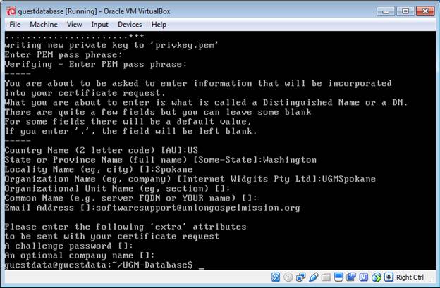 Next, you’ll be asked for some information.  Enter your country name, state name, city, company name, and email address (the other two are optional).  Be sure to leave the challenge password blank (unless you want to have to enter a password every time you start your guest database).  Hit enter on each line until you get a screen as shown above (only with your information).  You now have a new certificate.