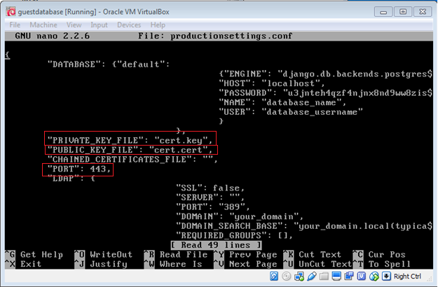 Now, run “nano productionsettings.conf” and enter cert.key and cert.cert between the quotes on the PRIVATE_KEY_FILE and PUBLIC_KEY_FILE lines respectively.  Also change the port to 443.  Hit CTRL+x to exit, answer “y” when asked if you want to save and hit ENTER when it asks for a file name.