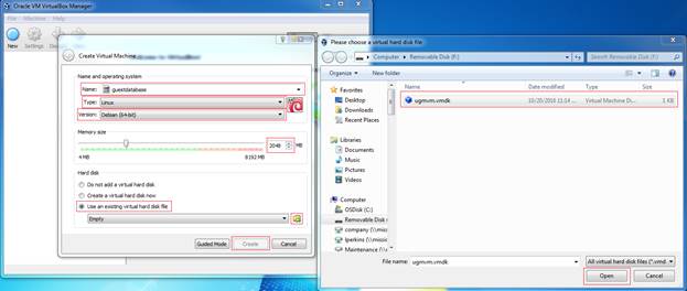 Enter a name, type, and version.  Set the memory to at least 2048, preferably 4096 if available. Select use and existing virtual hard disk file, and click the folder select.  Navigate to where you unpacked your download, select the ugmvm.vmdk file and click open.  Then click create which was previously greyed out.
