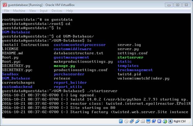 Alright, I am going to start going a little faster.  I am assuming you have figured out how to enter commands, so I will just explain what to run and show you the result of several commands at a time.  The first group is to run “cd /home/guestdata/UGM-Database/”.  This will Change Directory to the core of the database.  Then you run “ls” to get the screenshot above.  Notice the makeproductionsettings.py highlighted above (the red box won’t be on your screen, but the file should be listed).  This is what you are going to run next, but also notice the startserver file.  This will be your shortcut to start the server once we have configured it.  Finally, the manage.py file is what you will use when the database needs maintenance after any system updates requiring a database migration.  Such updates are clearly marked in the release notes.  We will cover all that in a little while.