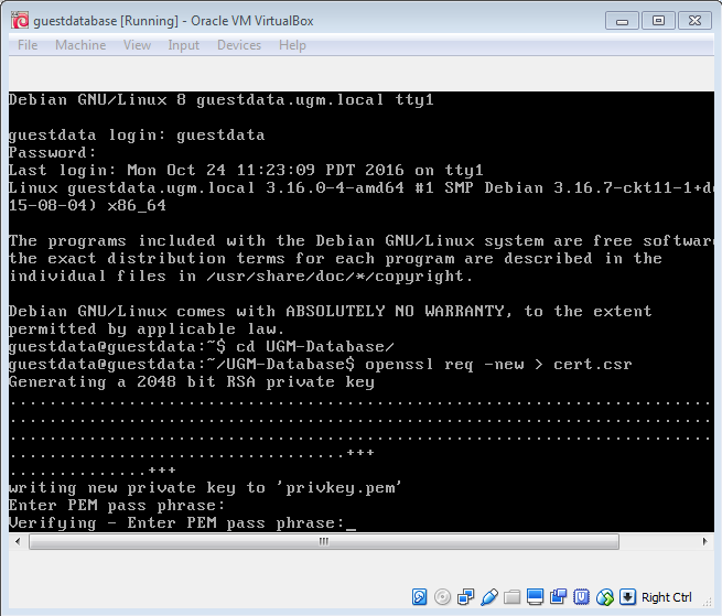 Now change directory to the database “cd UGM-Database” and run “openssl req –new > cert.csr”.  This will start the process of generating a new certificate.  When it asks for a pass phrase, put something in, but be sure to remember what you used.  It will ask you to verify the pass phrase by typing it in twice.