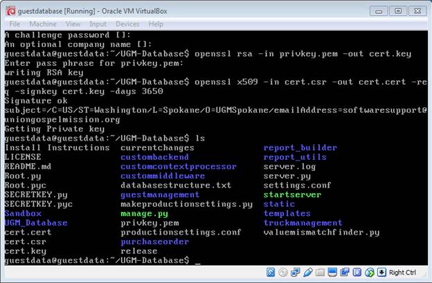 Next, you’ll be asked for some information.  Enter your country name, state name, city, company name, and email address (the other two are optional).  Be sure to leave the challenge password blank (unless you want to have to enter a password every time you start your guest database).  Hit enter on each line until you get a screen as shown above (only with your information).  You now have a new certificate.
